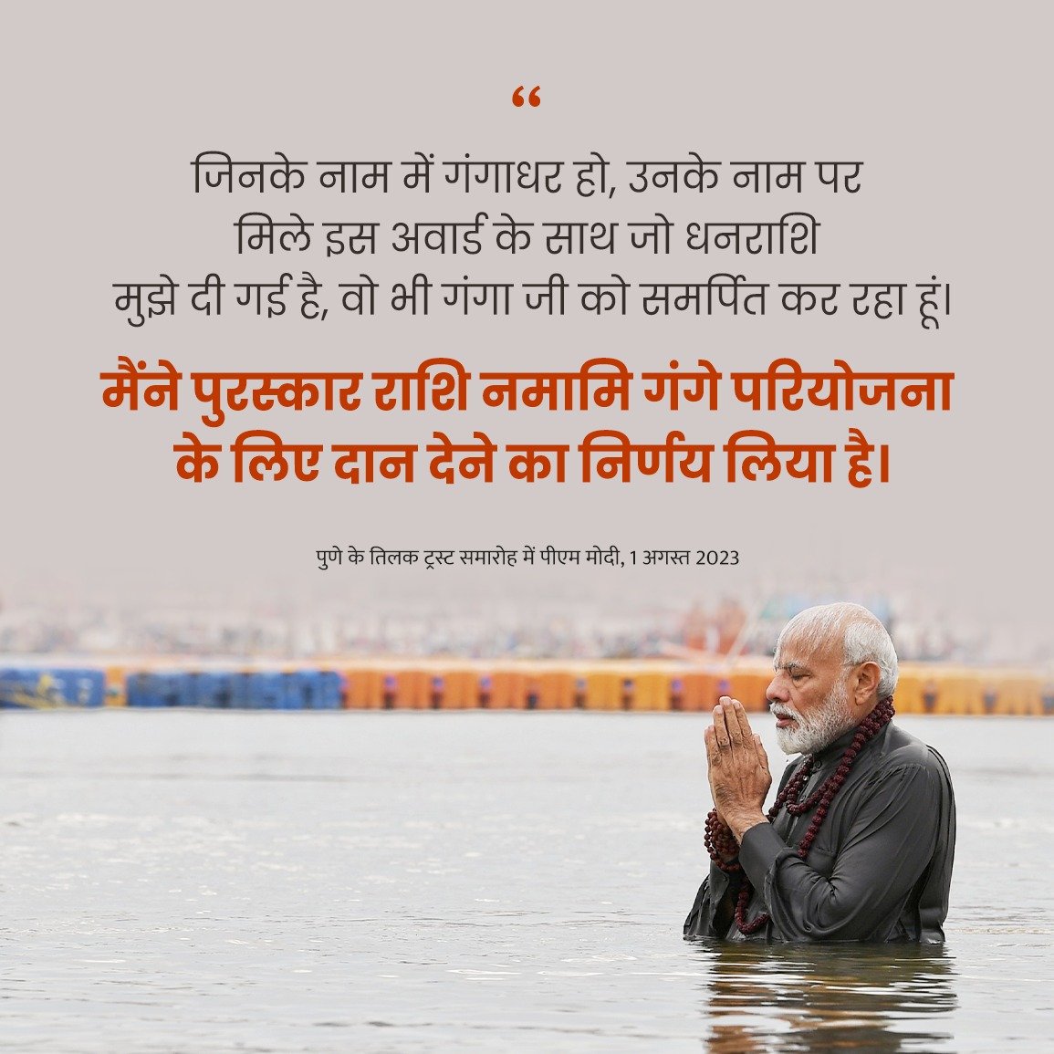 पीएम मोदी को मंगलवार को ‘लोकमान्य तिलक राष्ट्रीय पुरस्कार’ से सम्मानित किया गया है। यह सम्मान असाधारण नेतृत्व और नागरिकों के बीच देशभक्ति की भावना को बढ़ावा देने के उनके प्रयासों के लिए उन्हें ‘तिलक स्मारक मंदिर ट्रस्ट’ द्वारा प्रदान किया गया है। प्रधान मंत्री इस पुरस्कार के 41वें प्राप्तकर्ता बने। उन्होंने पुरस्कार राशि 1 लाख रुपये 'नमामि गंगे' परियोजना को दान करने का फैसला किया।